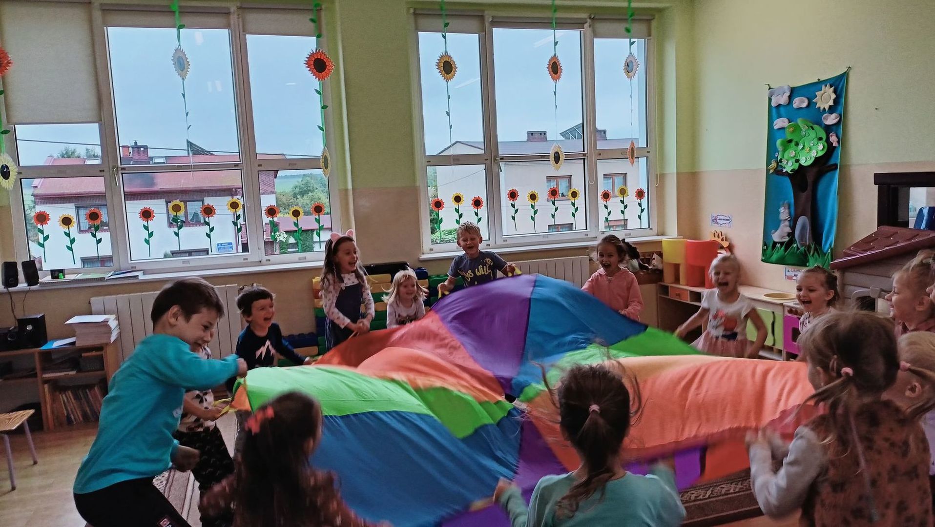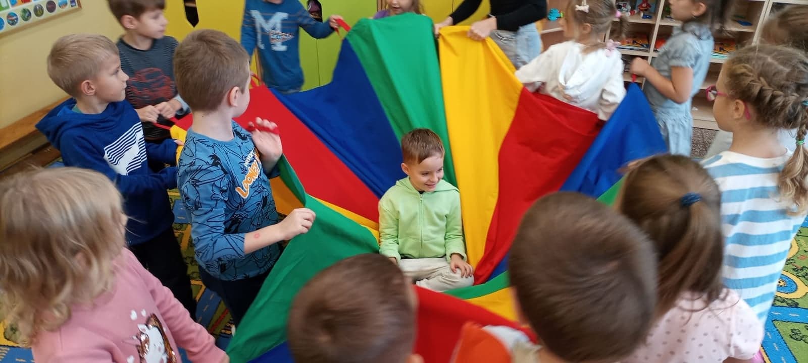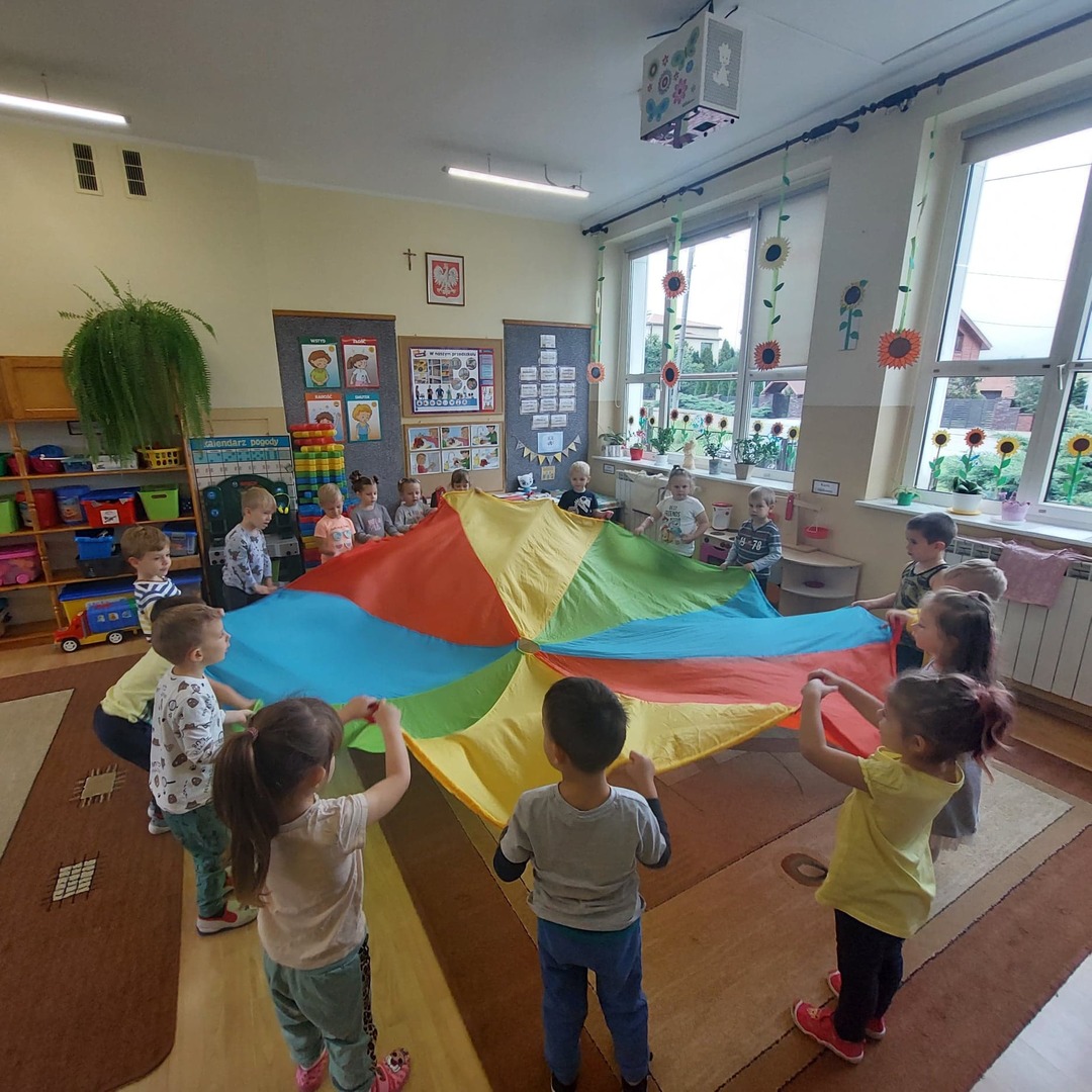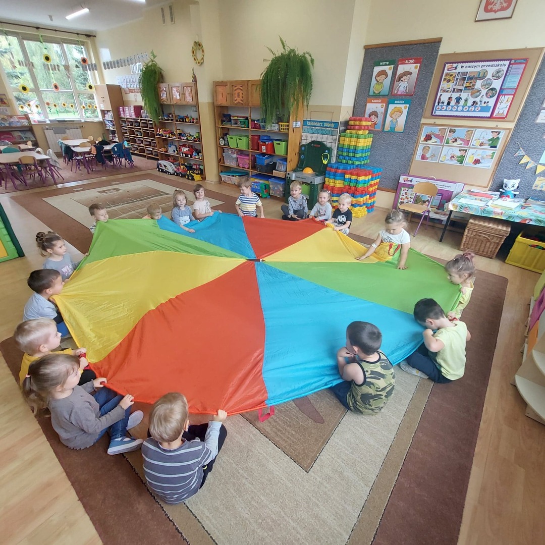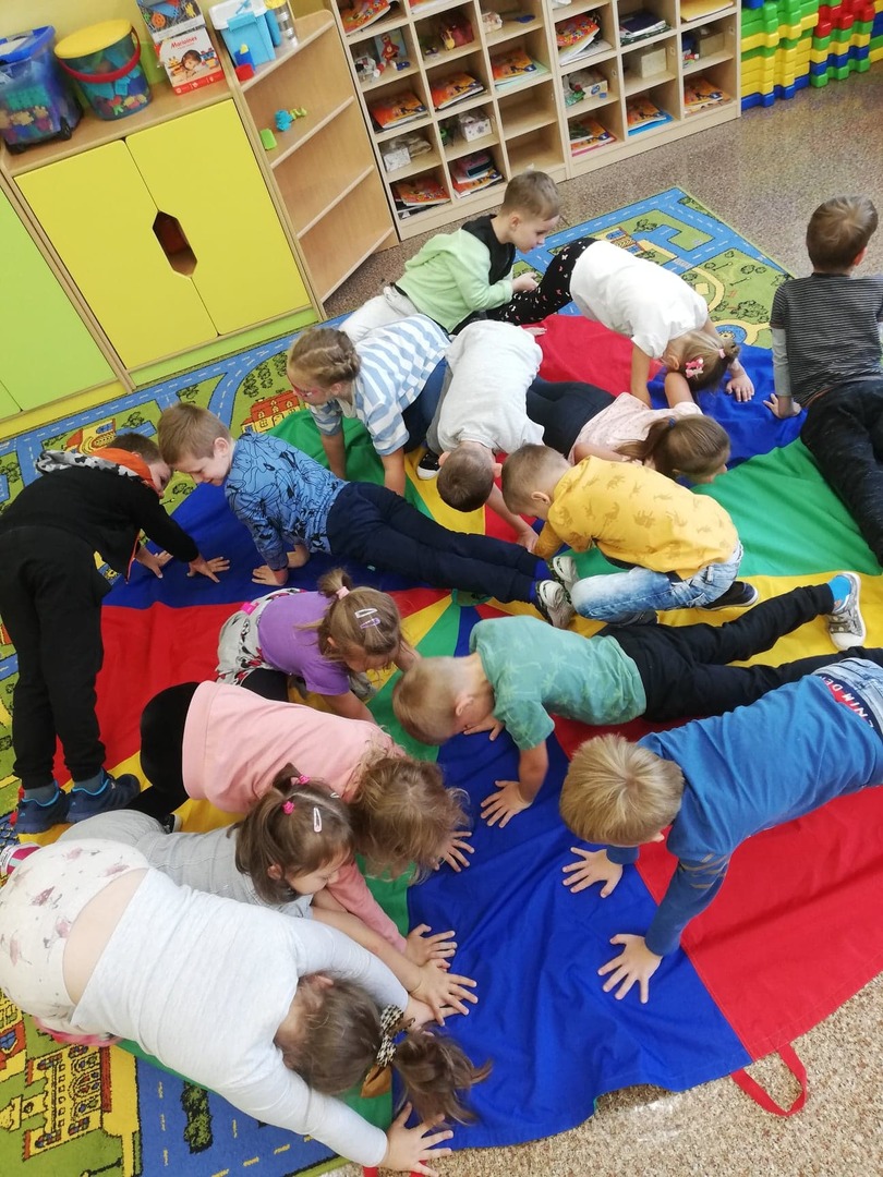 i atrakcji. Przedszkolacy uczestniczyli w zabawach muzyczno – ruchowych oraz zabawach z chustą animacyjną. Radość i śmiech były dowodem wspaniałej zabawy.
