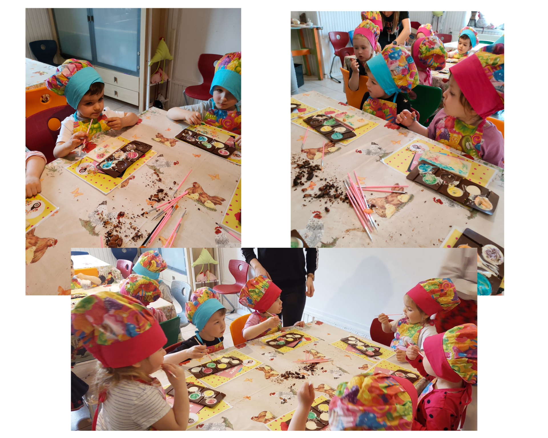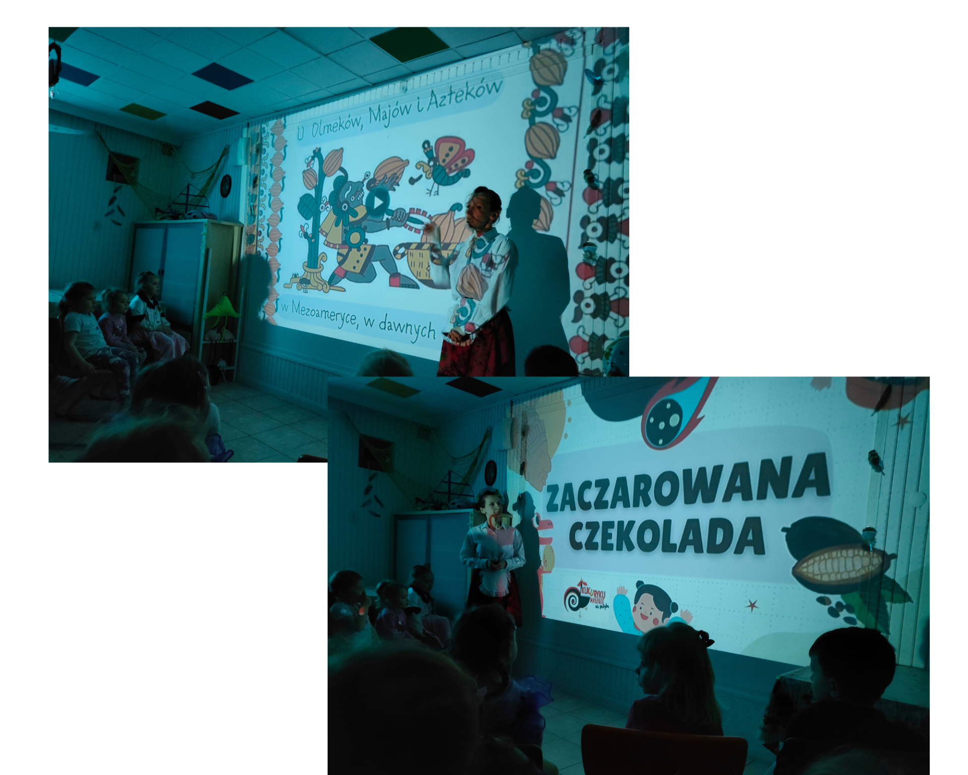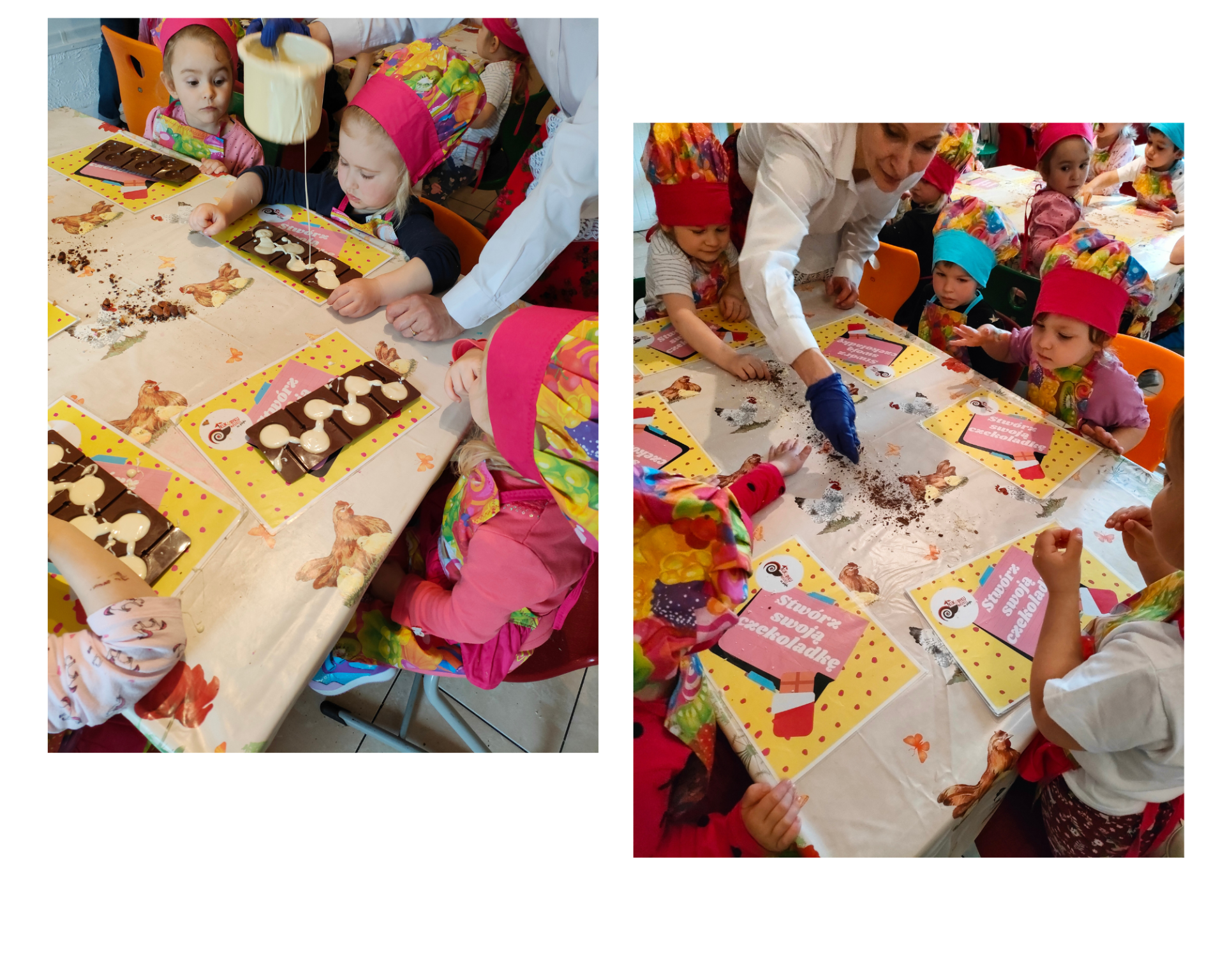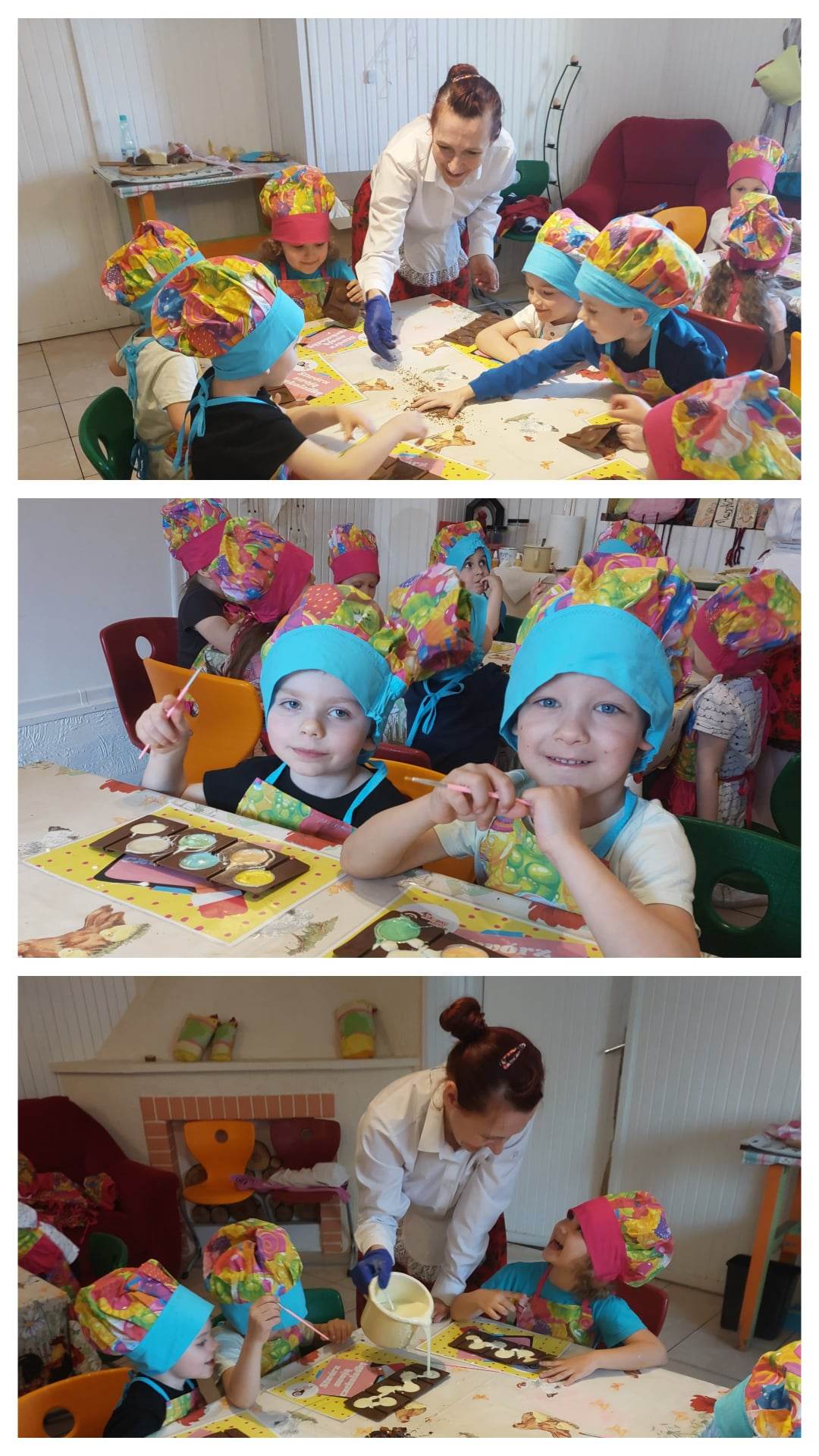 Przedszkolacy brali udział w słodkich warsztatach cukierniczych, które polegały na wykonaniu własnej czekolady. Dzieci obejrzały również edukacyjną prezentację dotyczącą prawdziwej czekolady oraz zbadały ziarno kakaowca. Nie zabrakło tańców, pląsów i przebierania za bajkowe postacie. Była to niesamowita podróż w krainę doznań wzrokowych, dotykowo- manualnych, smakowych i zapachowych.