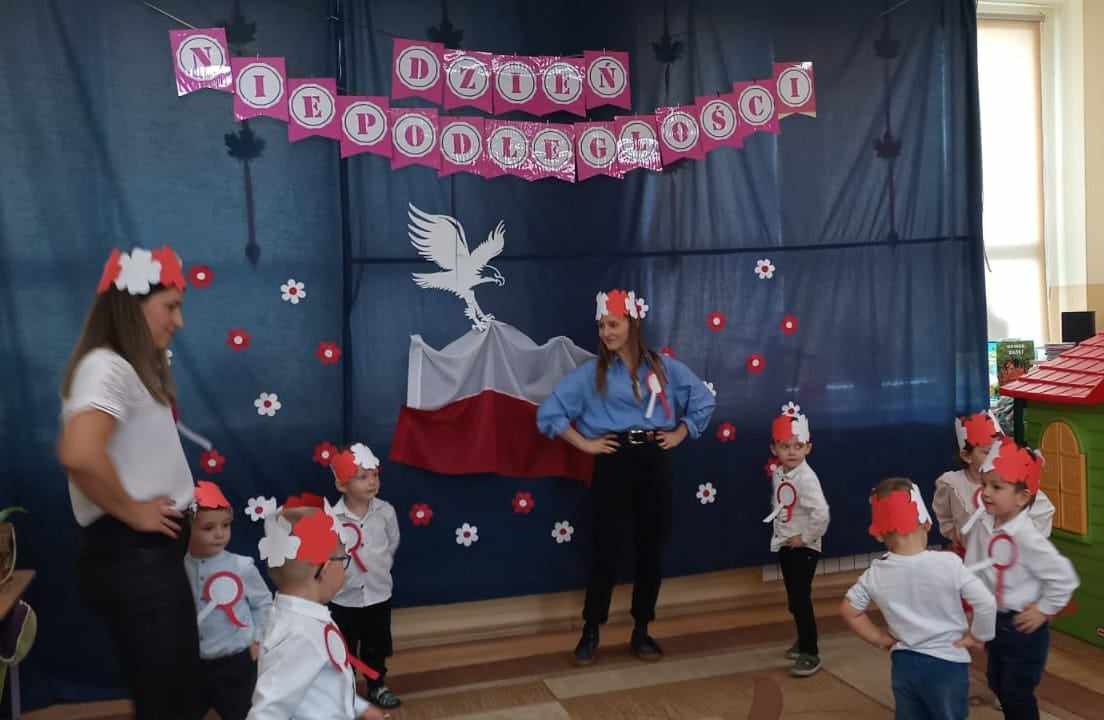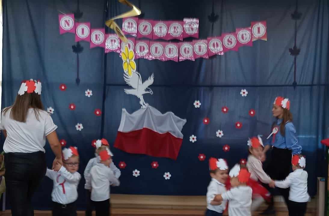 ➡️Dzieci ze wszystkich grup zaprezentowały występy artystyczne. Był taniec Krakowiaczek, piosenki i wiersze patriotyczne.