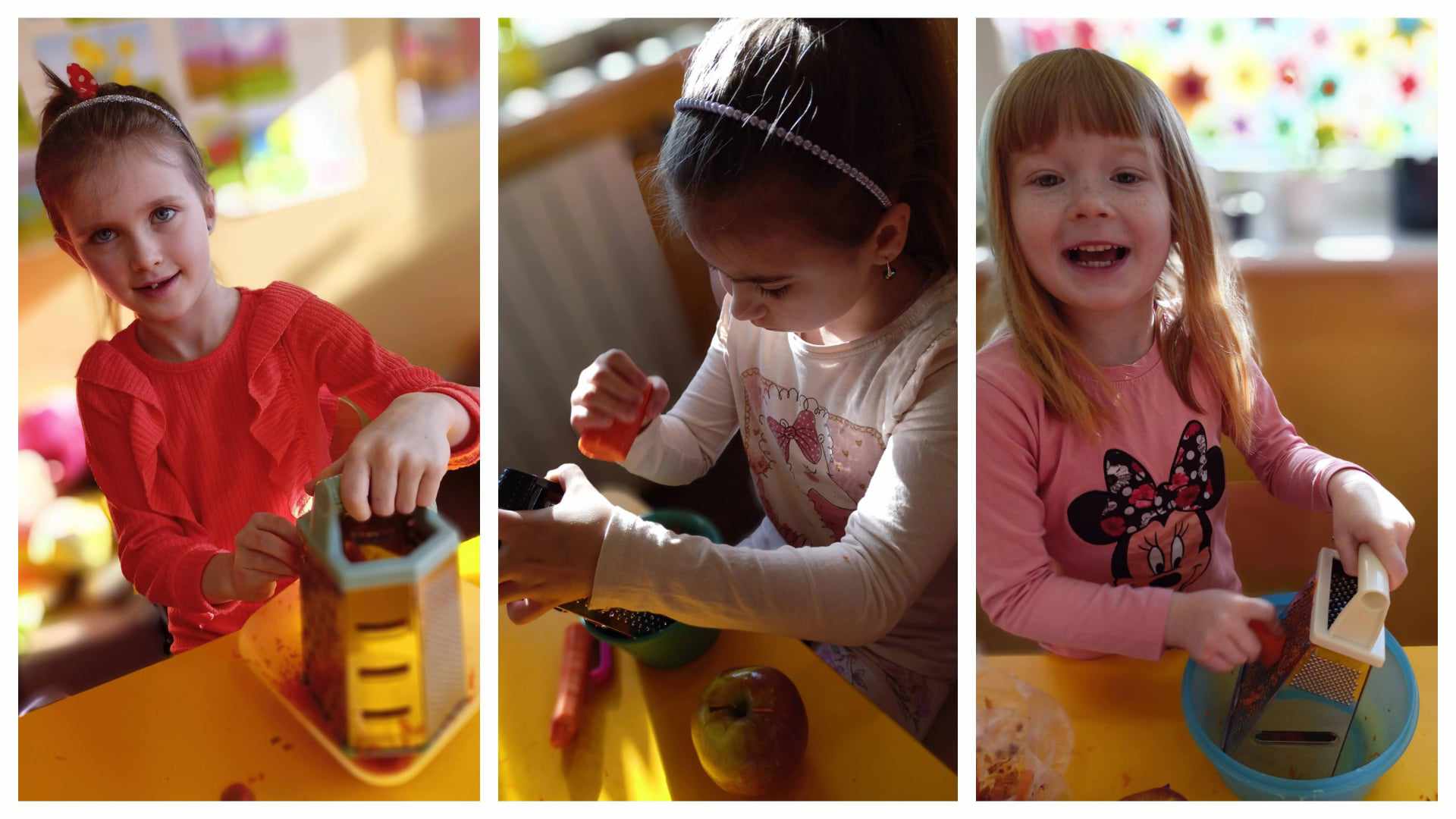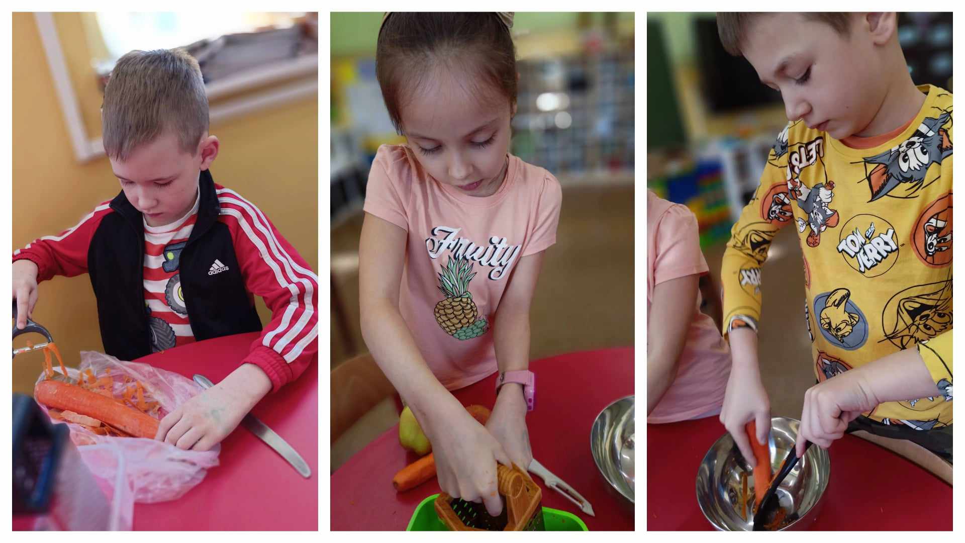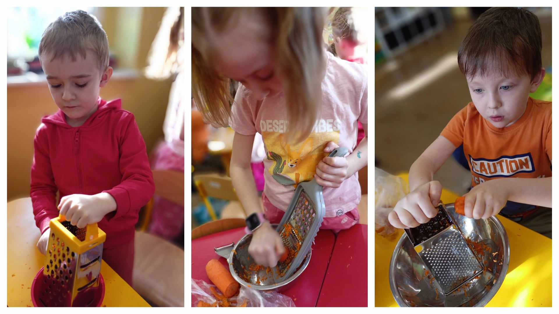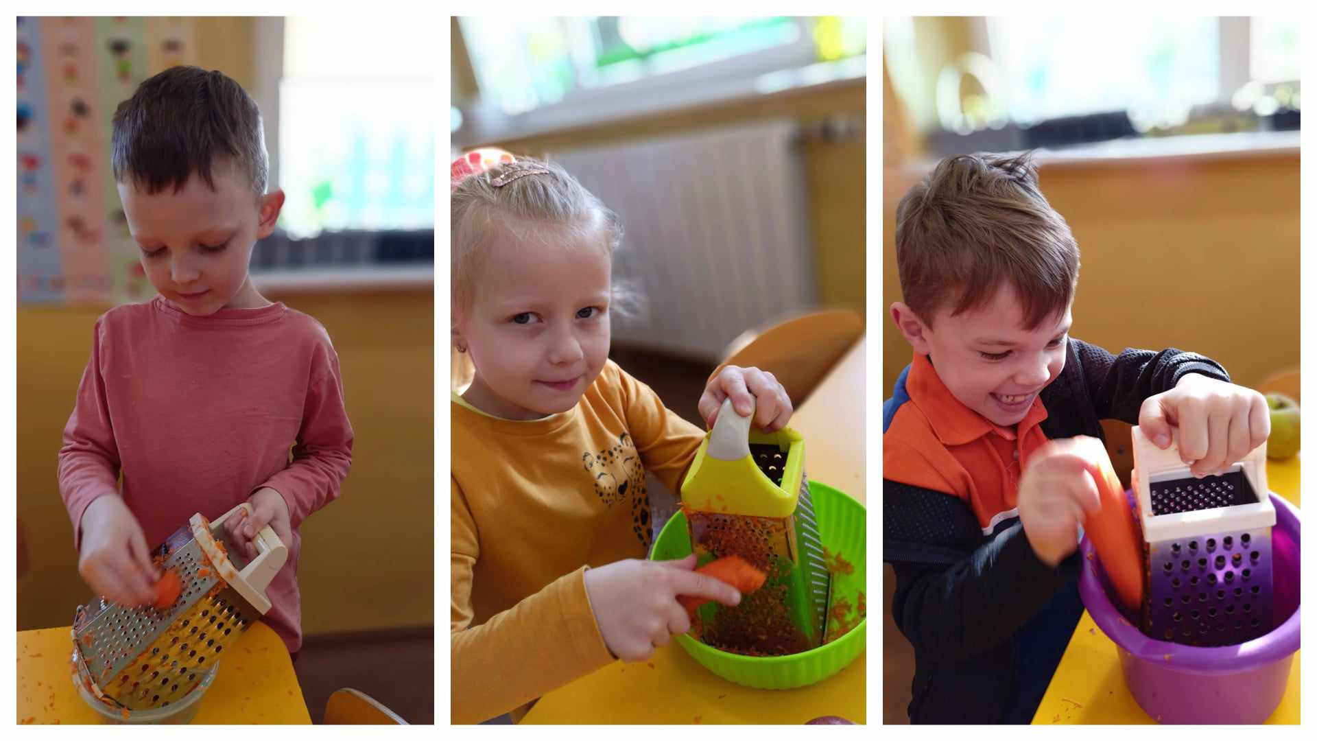 馃Starszacy w tym dniu przynie艣li marchewk臋, jab艂ko, obieraczk臋 do warzyw i tark臋. Pomagaj膮c w przygotowaniu da艅, dzieci doskonali艂y motoryk臋 ma艂膮. Obieranie warzyw, a p贸藕niej tarcie na tarce wymaga艂o skupienia i odpowiedniego nacisku r臋ki.