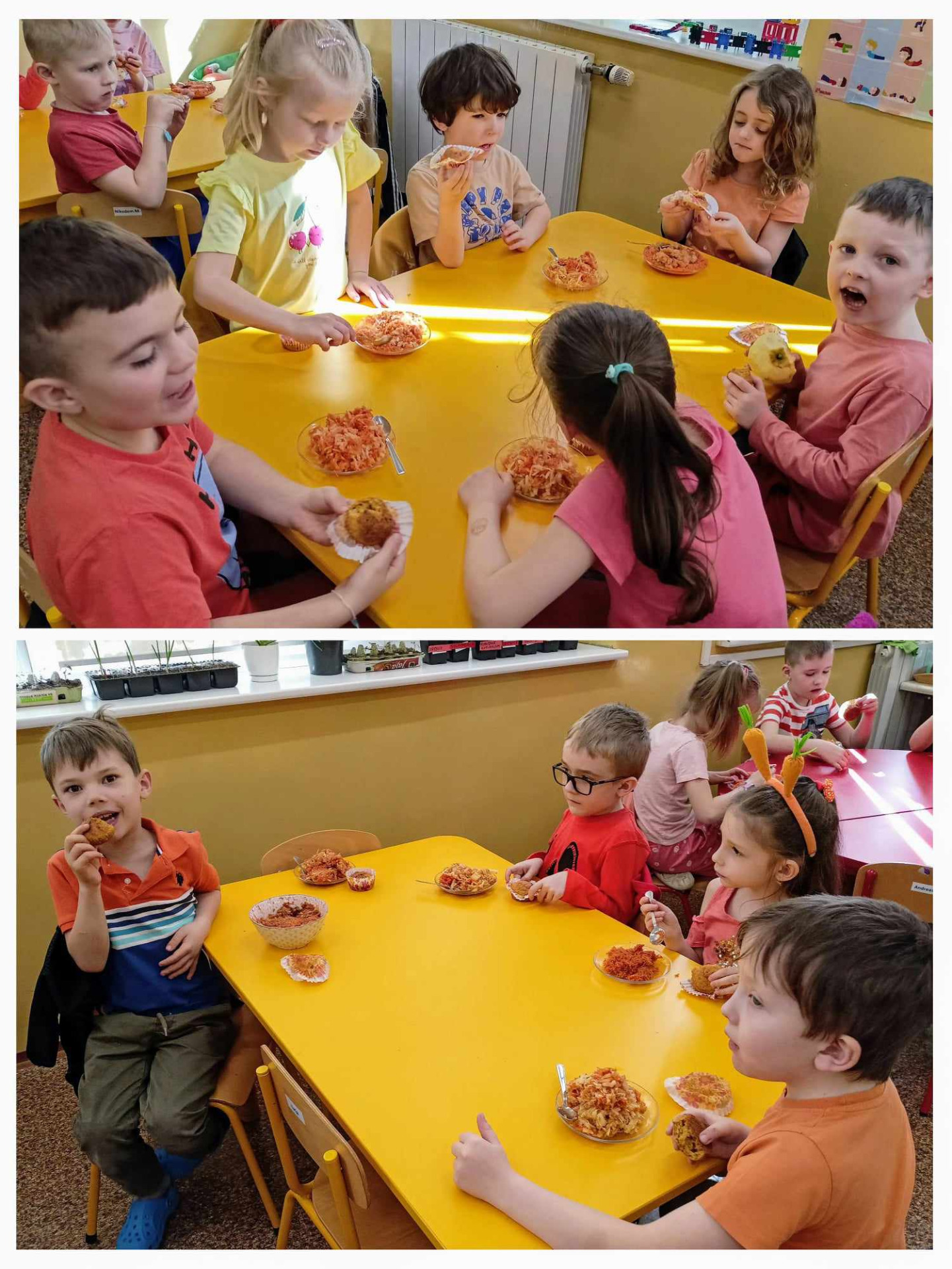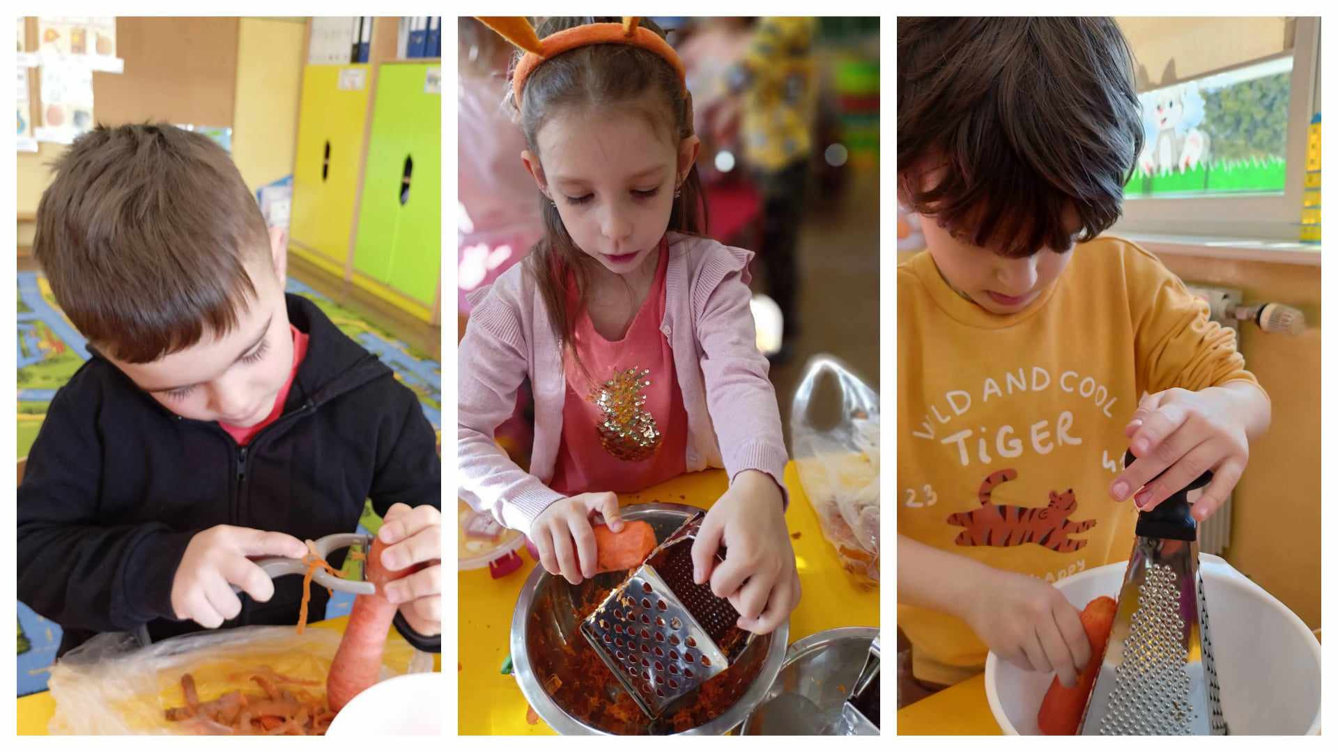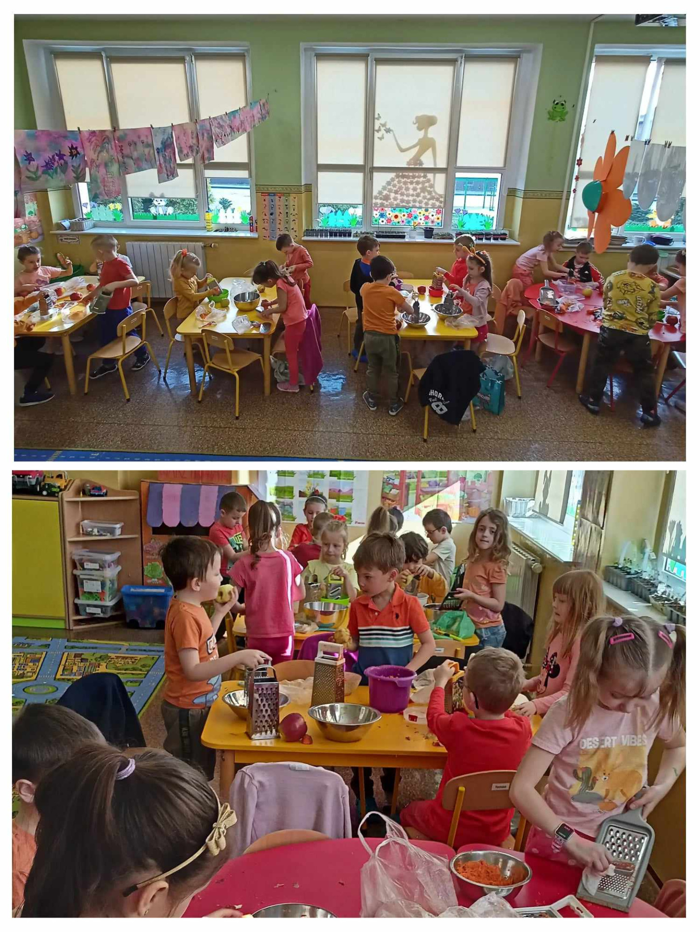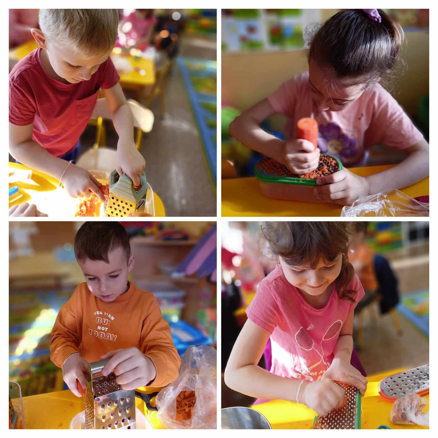 馃Starszacy w tym dniu przynie艣li marchewk臋, jab艂ko, obieraczk臋 do warzyw i tark臋. Pomagaj膮c w przygotowaniu da艅, dzieci doskonali艂y motoryk臋 ma艂膮. Obieranie warzyw, a p贸藕niej tarcie na tarce wymaga艂o skupienia i odpowiedniego nacisku r臋ki.