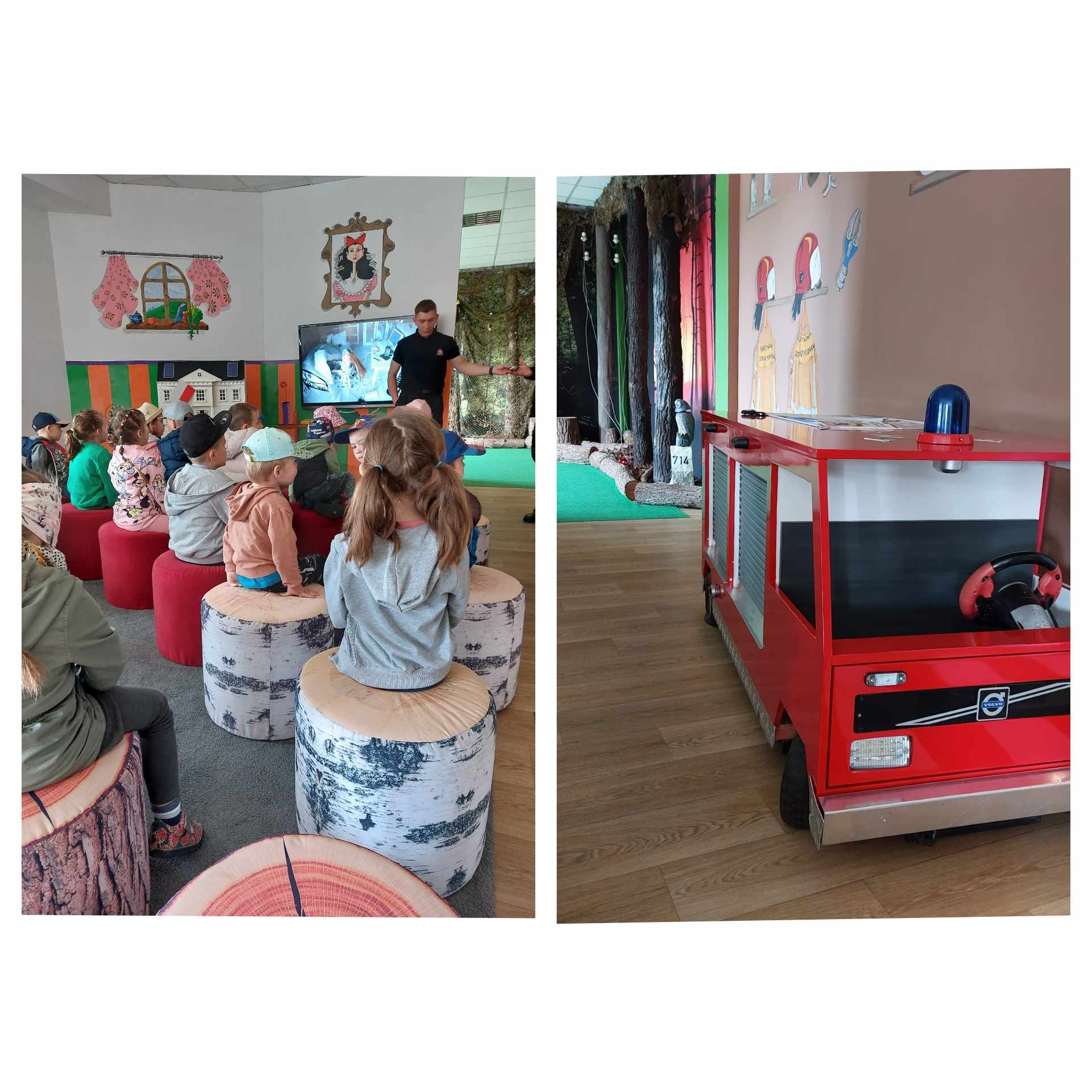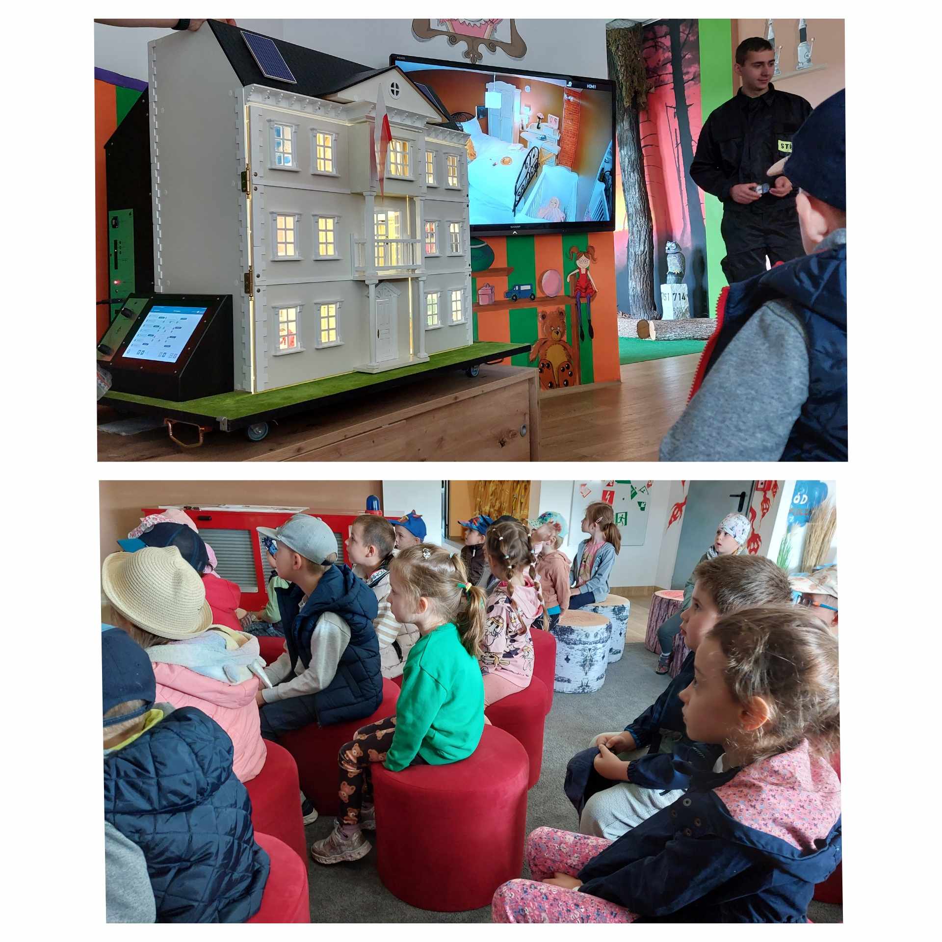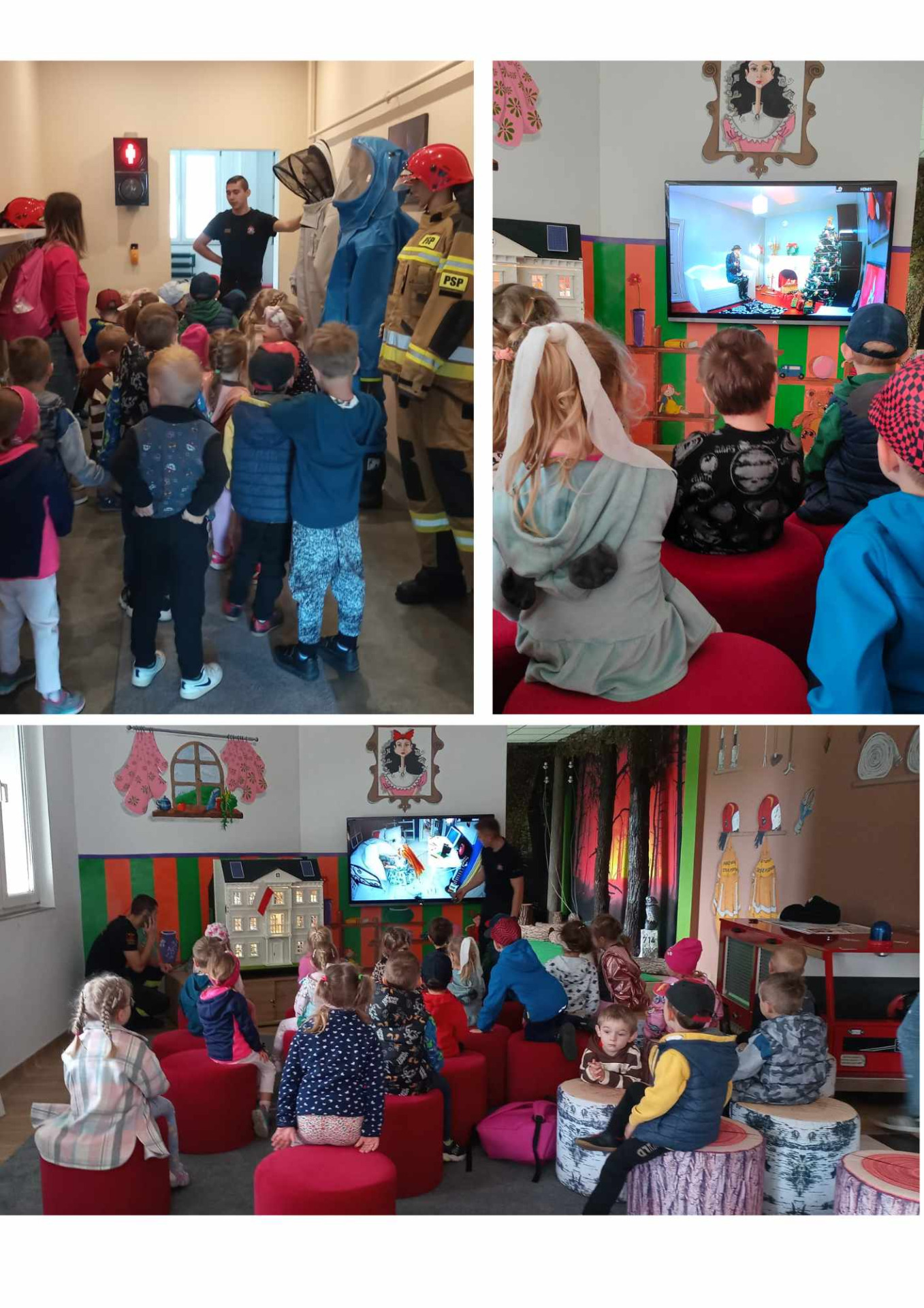 🟥Pierwszym z punktów wycieczki, była wizyta w sali edukacyjnej „Ognik” w Komendzie Powiatowej PSP w Lublińcu. Dzieci dowiedziały się m. in. jak zachować się w trakcie pożaru mieszkania, zapalenia ubrania oraz jak powstaje ogień i jak bardzo jest niebezpieczny.