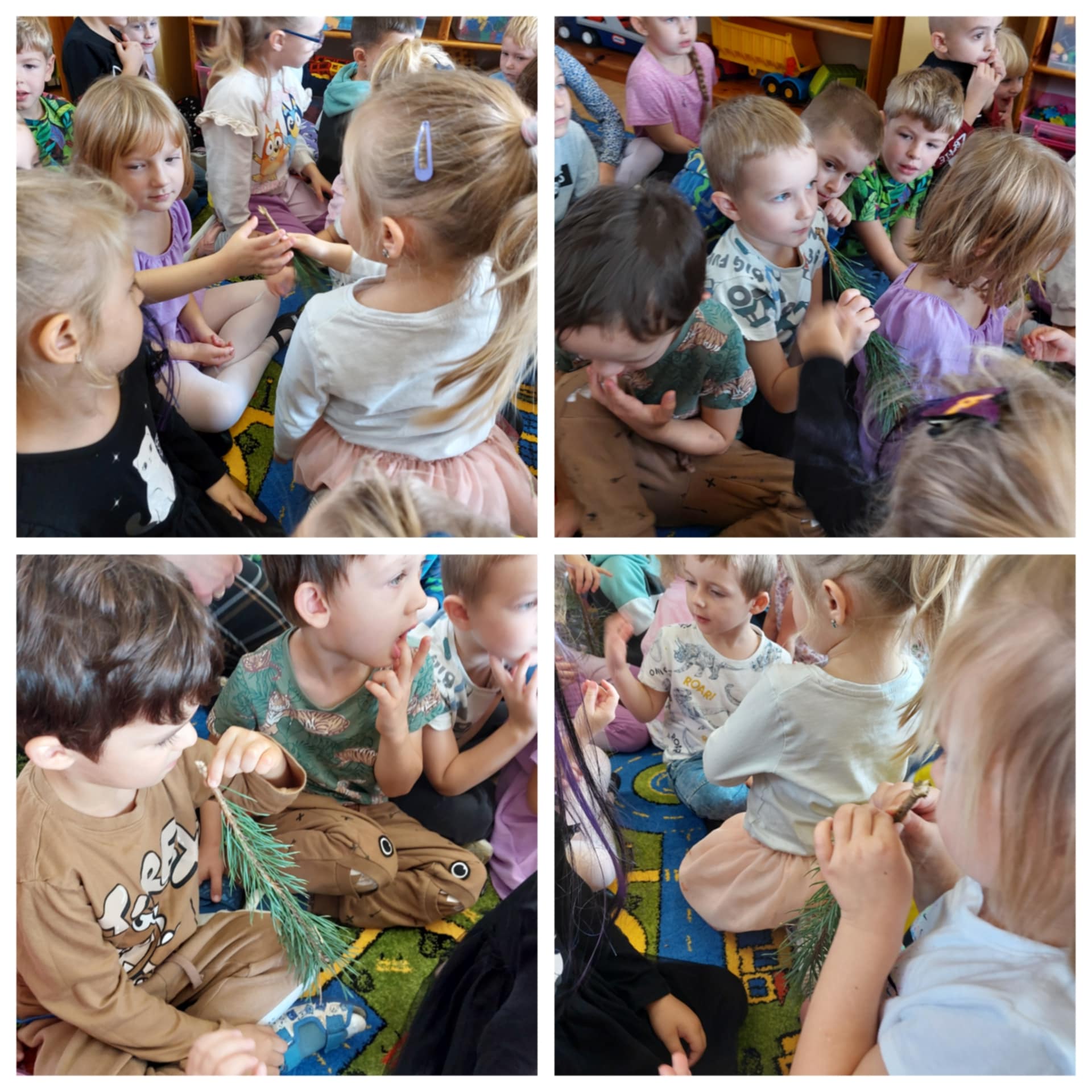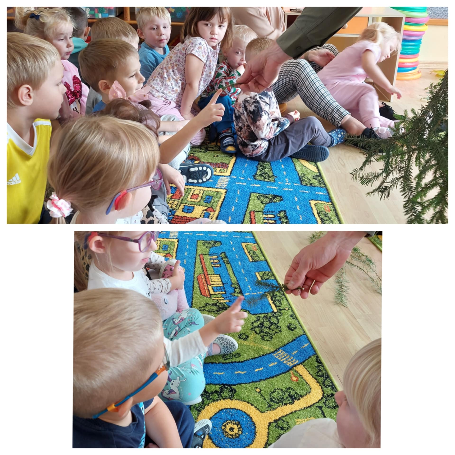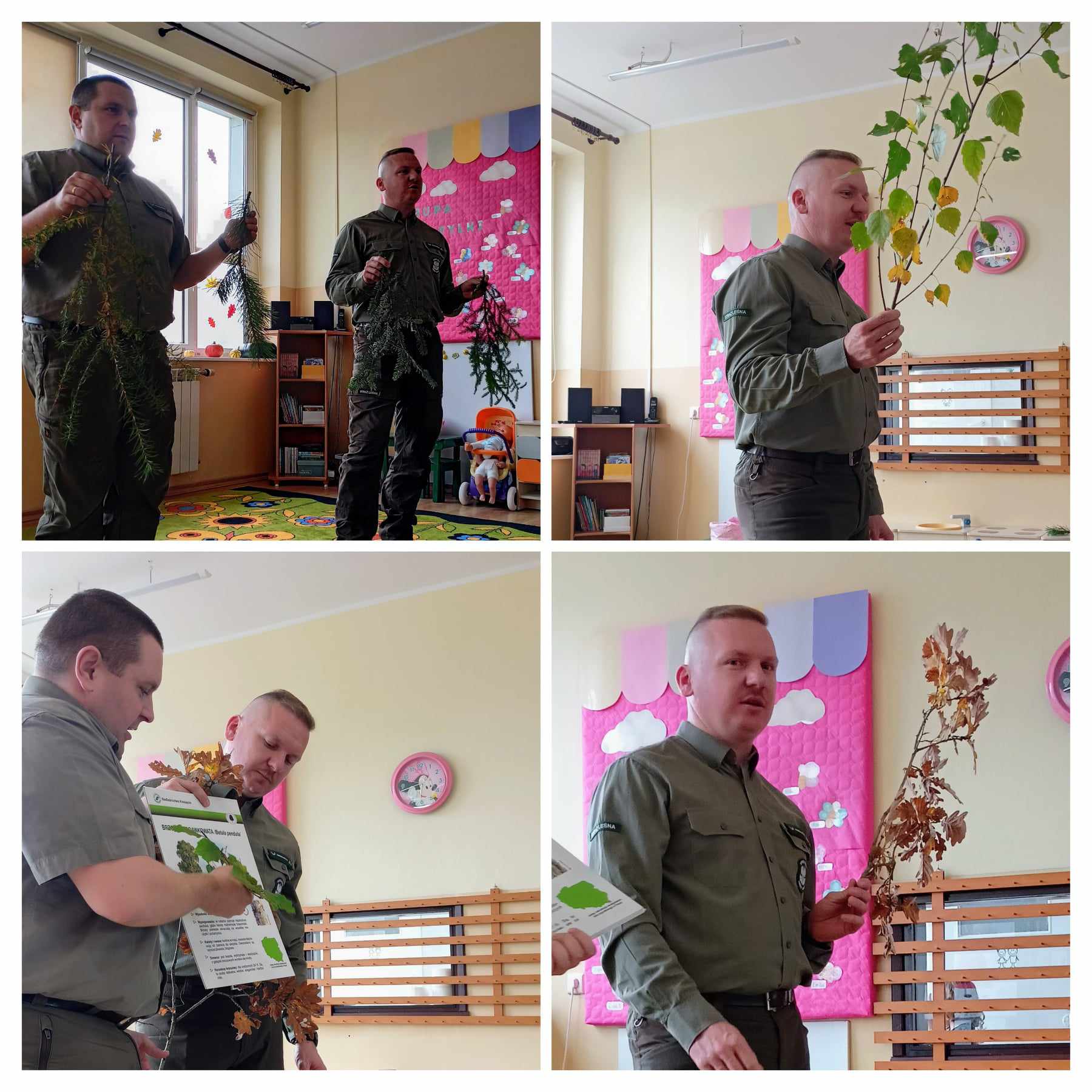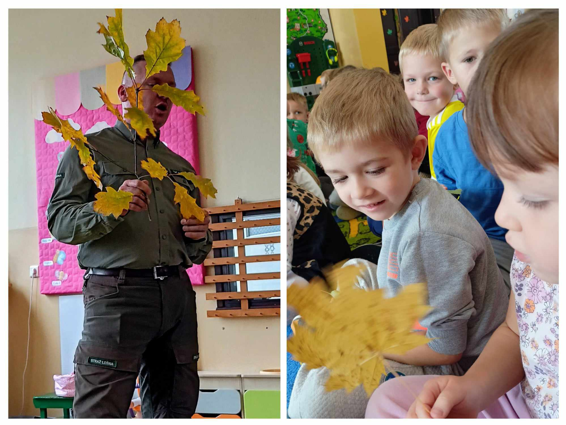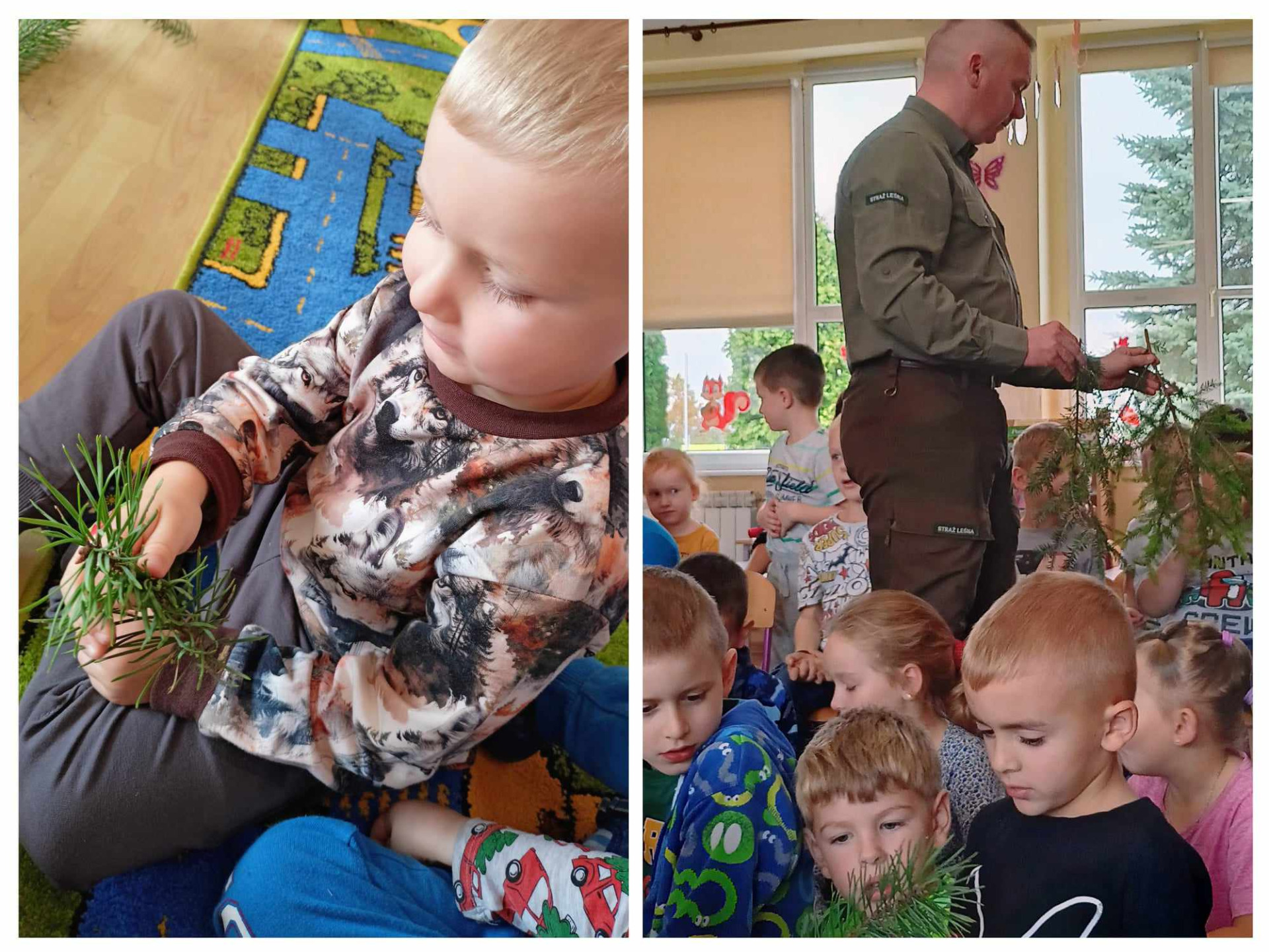 🟢Leśnicy przypomnieli również przedszkolakom nazwy drzew, a także zaprezentowali wygląd liści – dzieci miały okazję zobaczyć gałązki drzew liściastych i iglastych, porównać kształty ich liści, poczuć zapach lasu, a także sprawdzić, które gałązki kłują najbardziej.🍁🍂🌿🌳🌲
