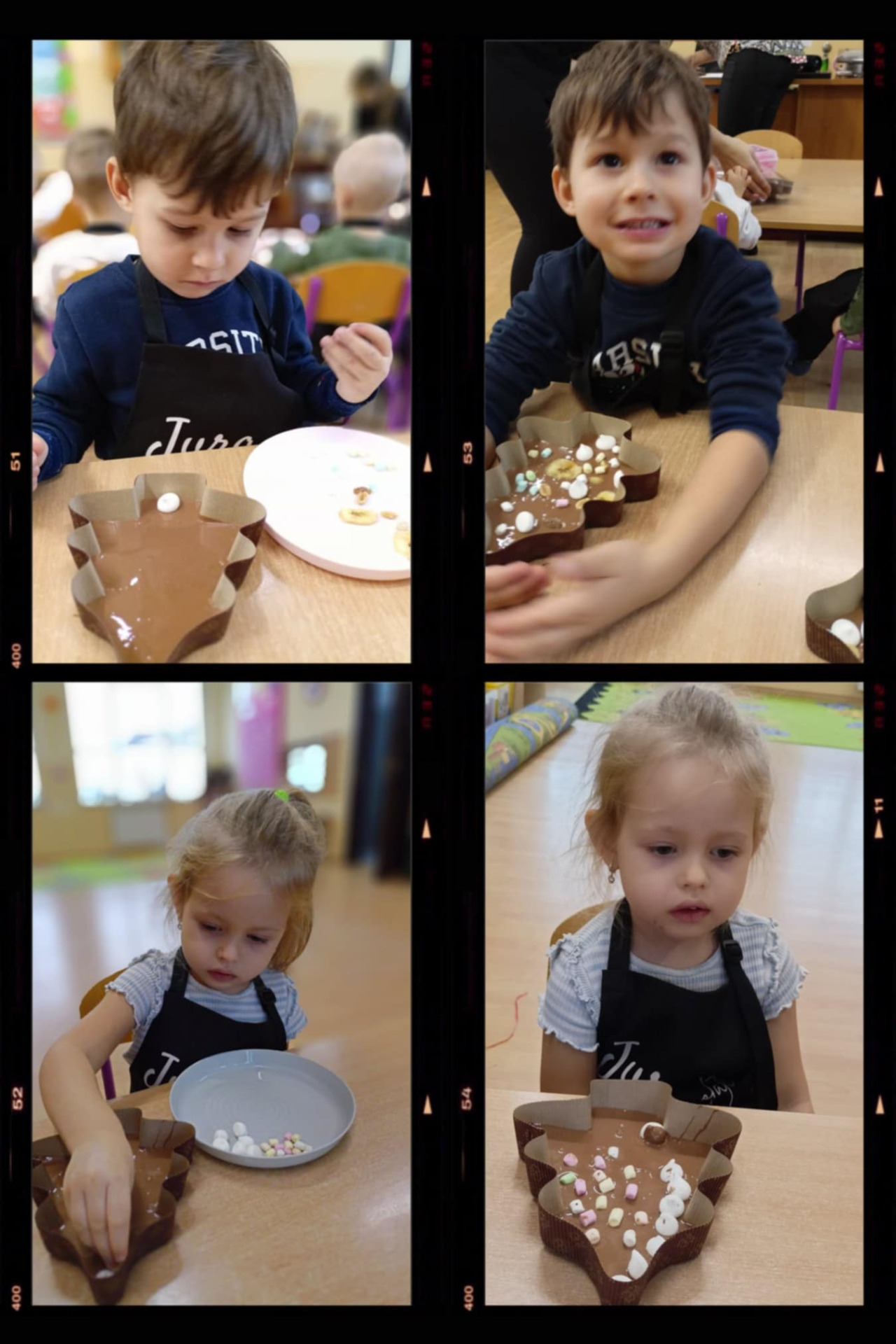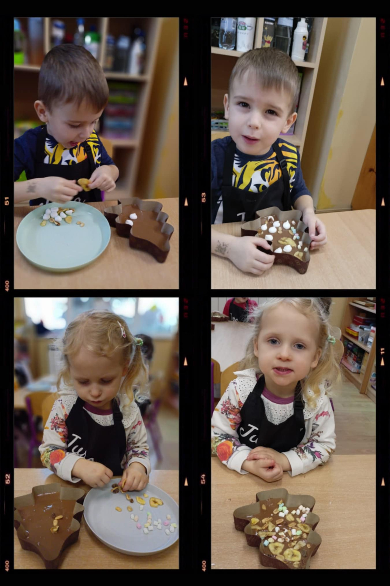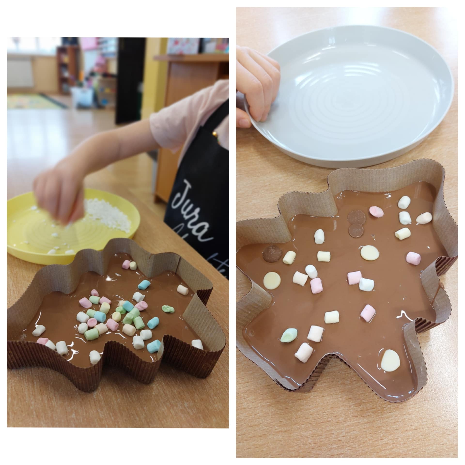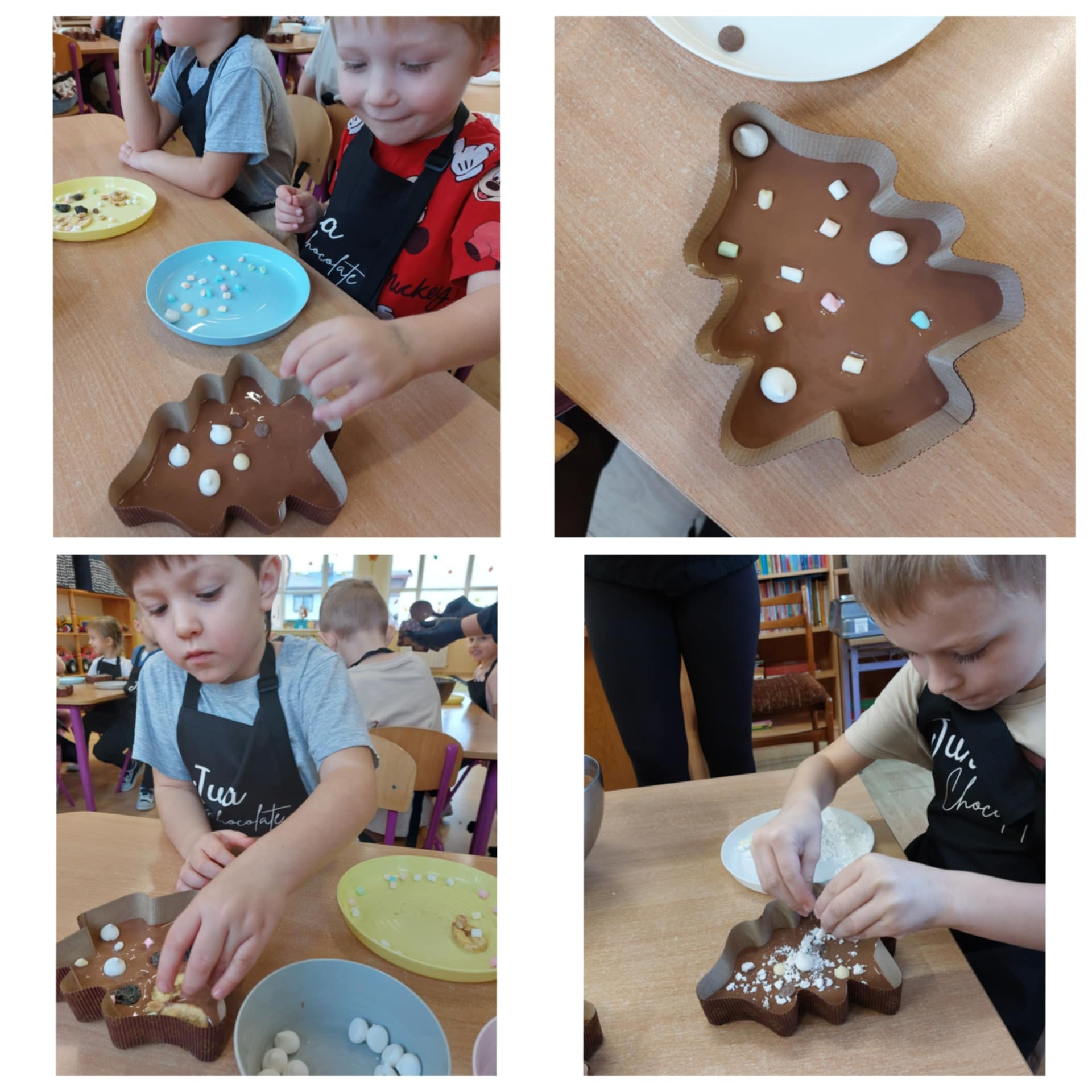 🟤Następnie, ubrani w fartuszki, przystąpili do tworzenia swojej czekoladowej choinki wylewając czekoladę na formę oraz przyozdabiając ją piankami, mini bezami, suszonymi bananami oraz bakaliami. 🌲🍫