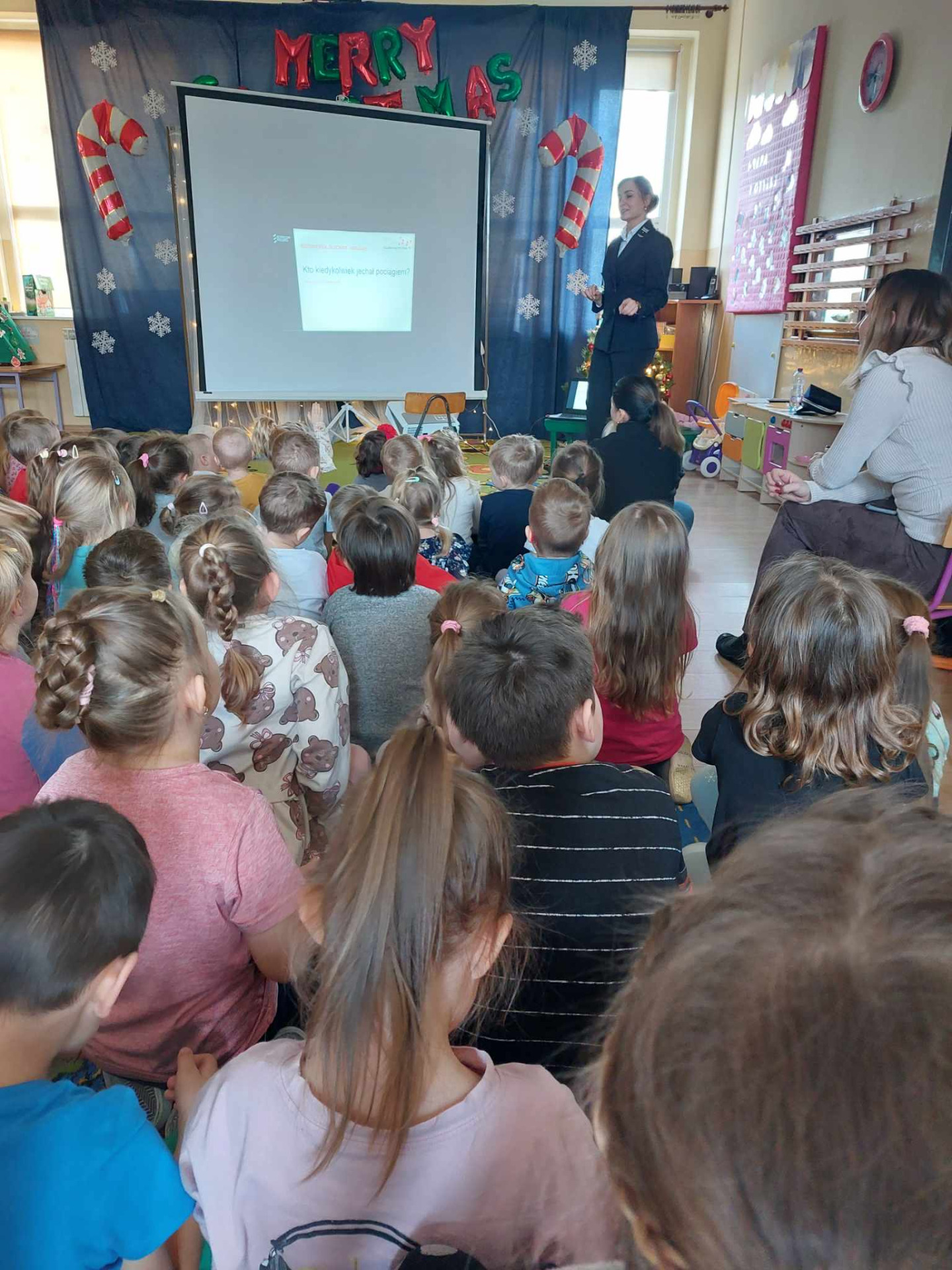 Pani koordynator wyjaśniła dzieciom co to jest Krzyż Świętego Andrzeja i jakie inne oznaczenia ostrzegają kierowców o przejeździe kolejowym oraz jak należy się przed nim zachować.🚆