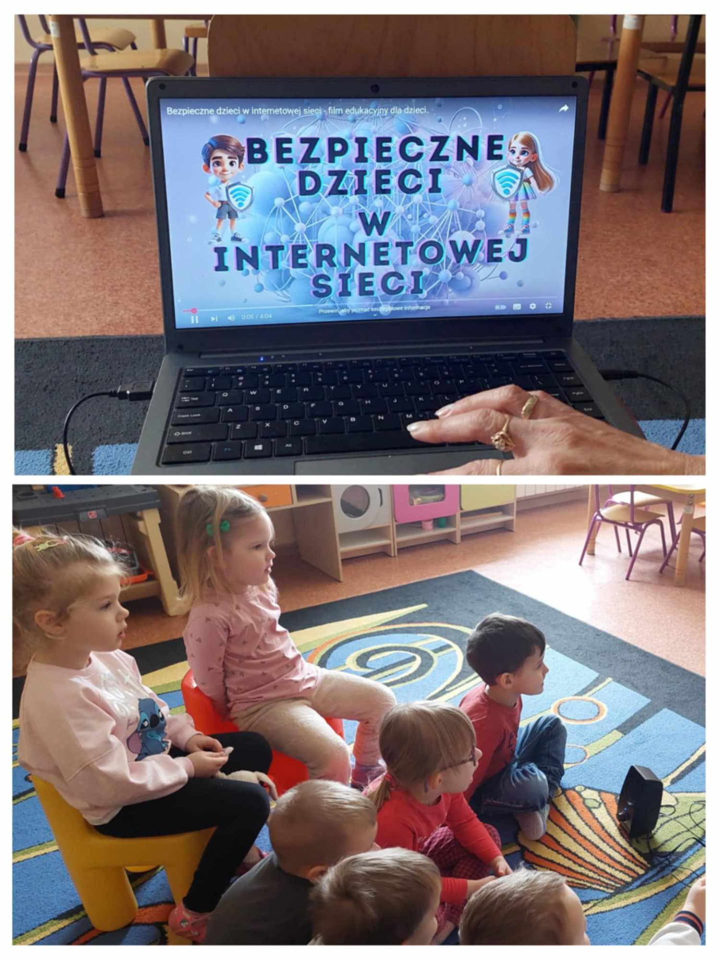 Przedszkolaki wysłuchały także opowiadań dotyczących bezpieczeństwa w sieci, m.in. „Przygoda Zosi w sieci” oraz „Bezpieczna podróż po internecie”.