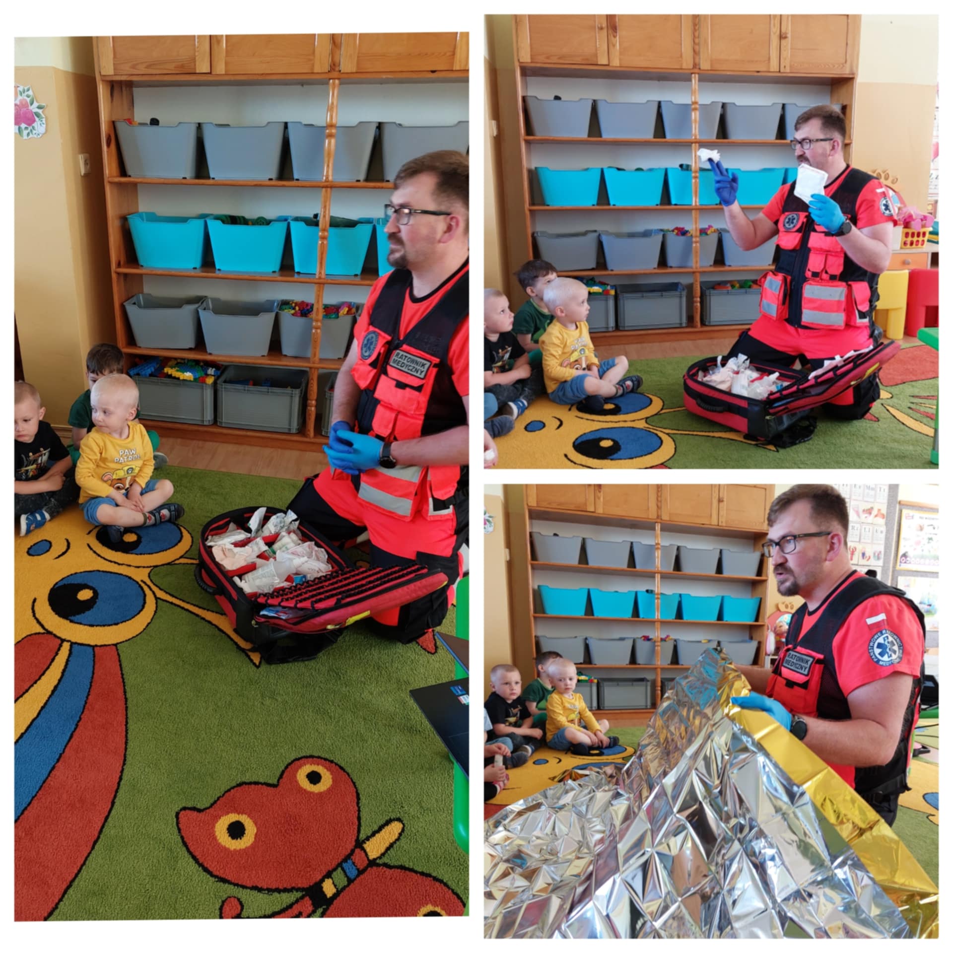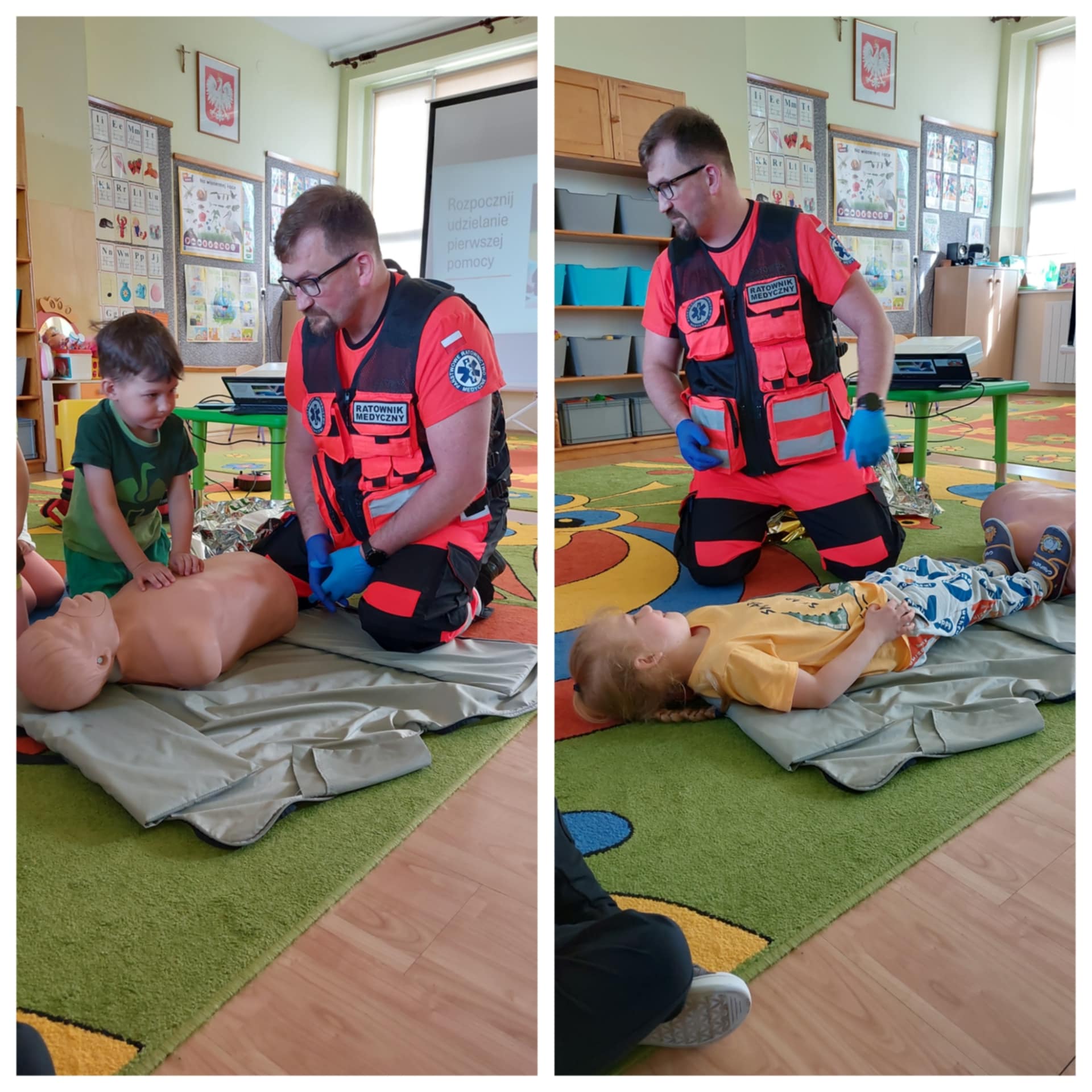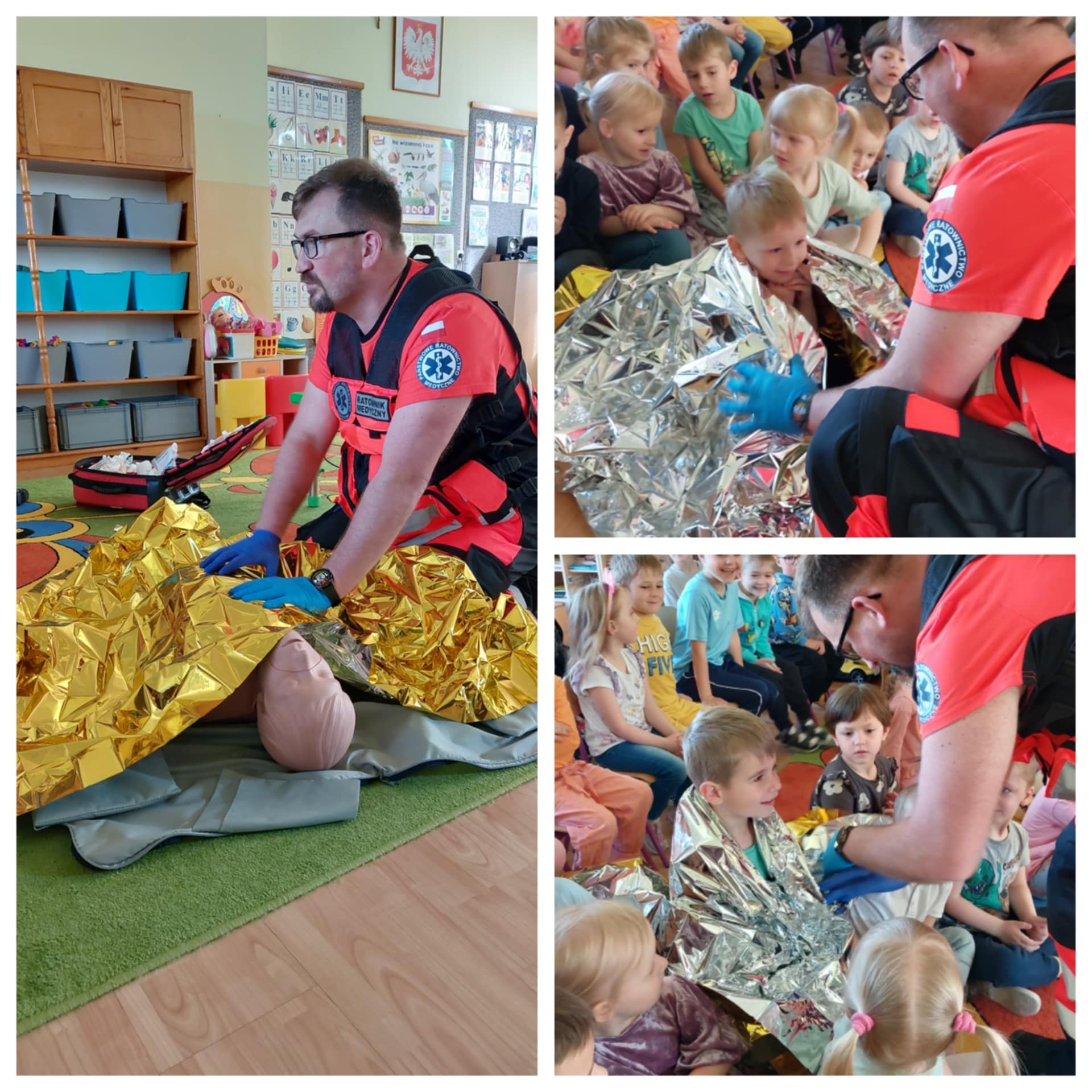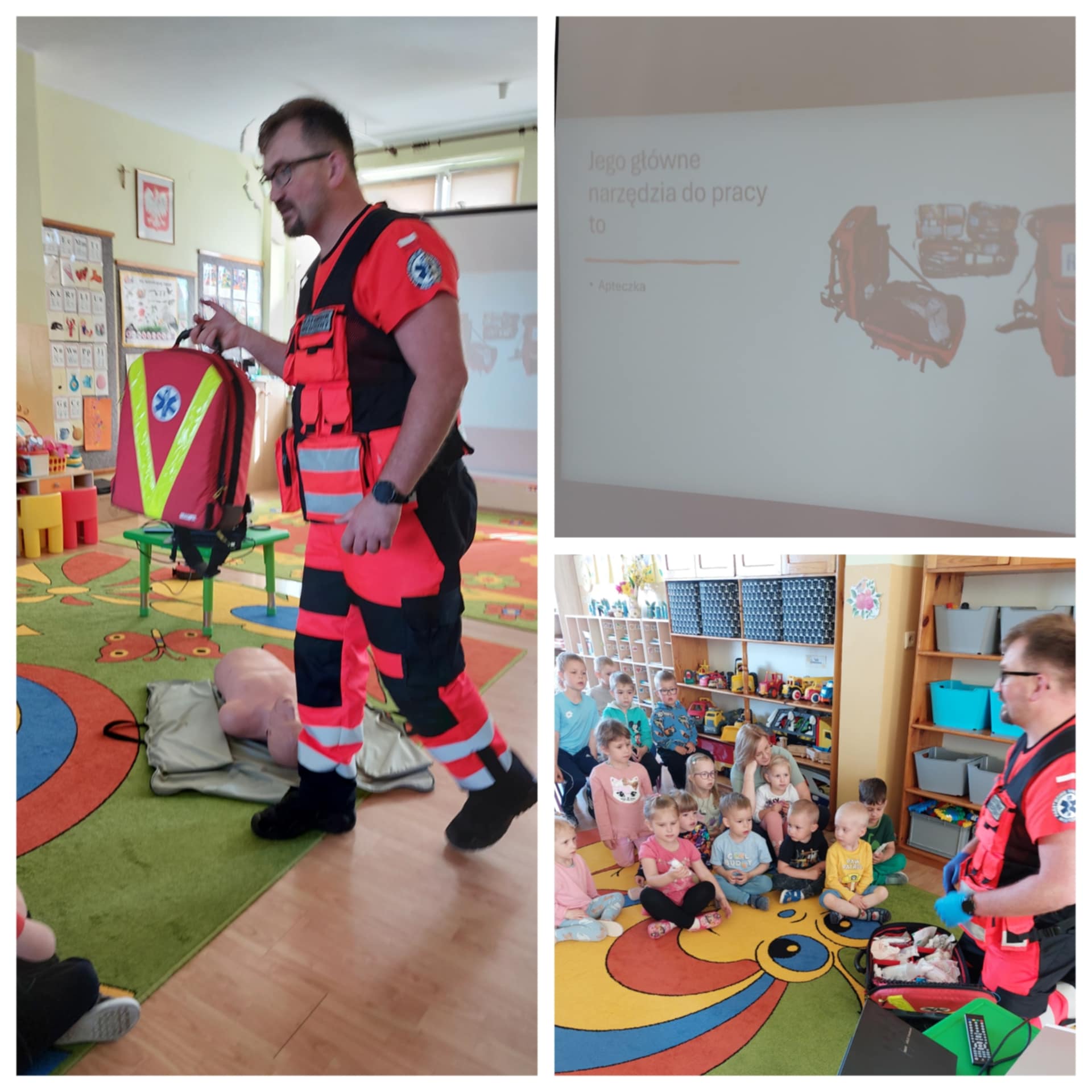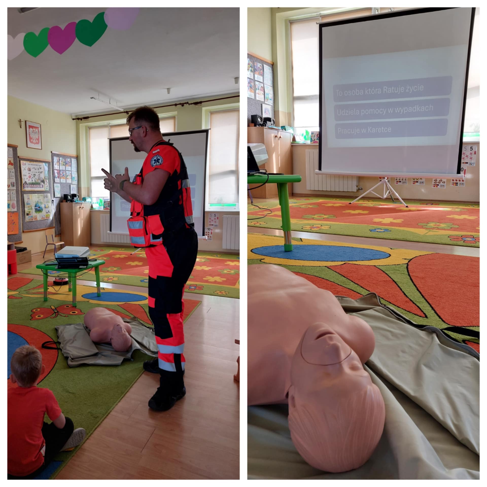 馃搷W 艣rod臋, 23 kwietnia przyby艂 do nas ratownik medyczny - Pan Tomasz Mazur, aby pokaza膰 dzieciom, jak wa偶na jest umiej臋tno艣膰 udzielania pierwszej pomocy.