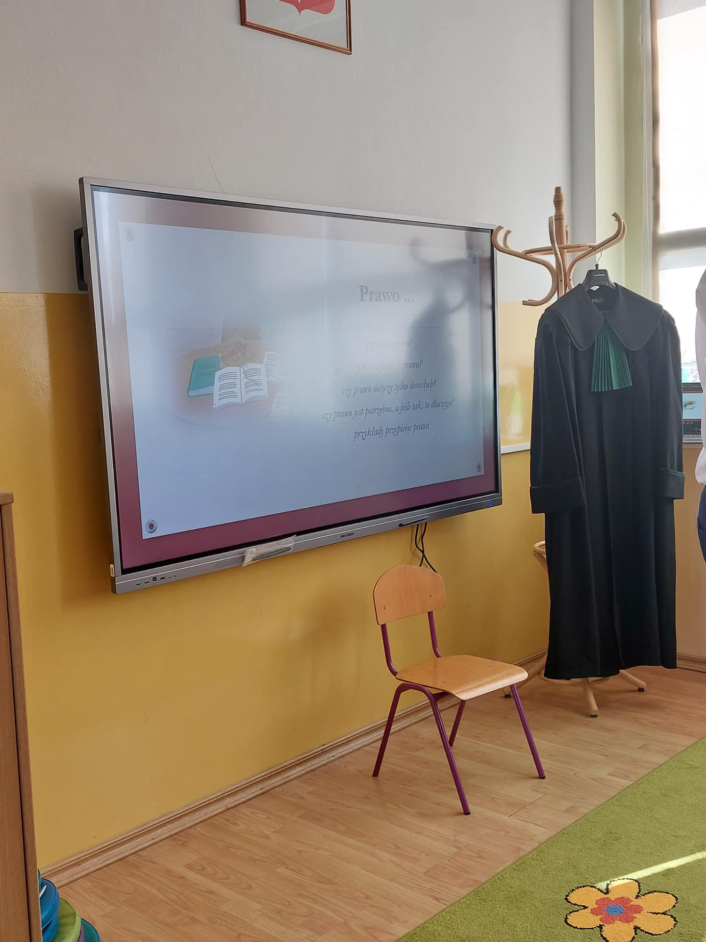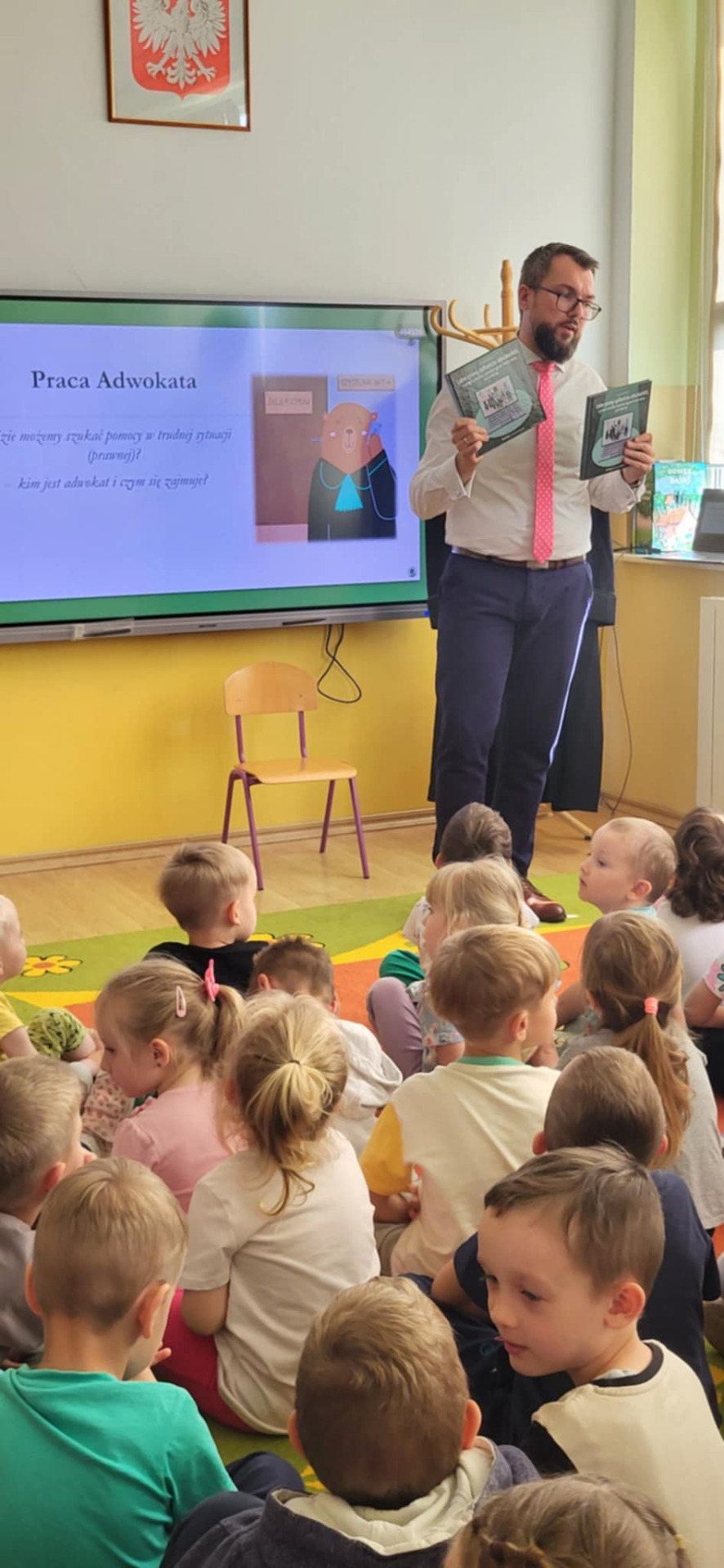Obejrzały także prezentację, pełną kolorowych ilustracji i ciekawostek, dzięki której mali słuchacze z zainteresowaniem poznawali świat prawa. 📚📖