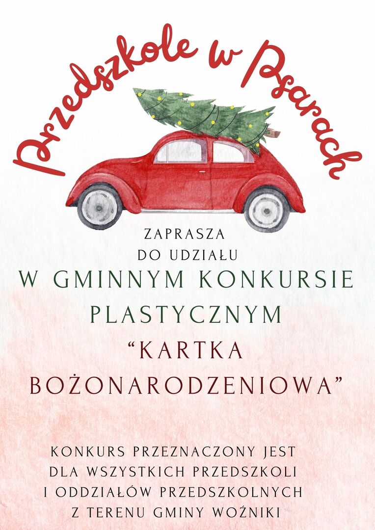 Przedszkole w Psarach ogłasza Gminny Konkurs Plastyczny - "KARTKA BOŻONARODZENIOWA" i zaprasza dzieci wszystkich przedszkoli/oddziałów przedszkolnych Gminy Woźniki do udziału w tym konkursie.