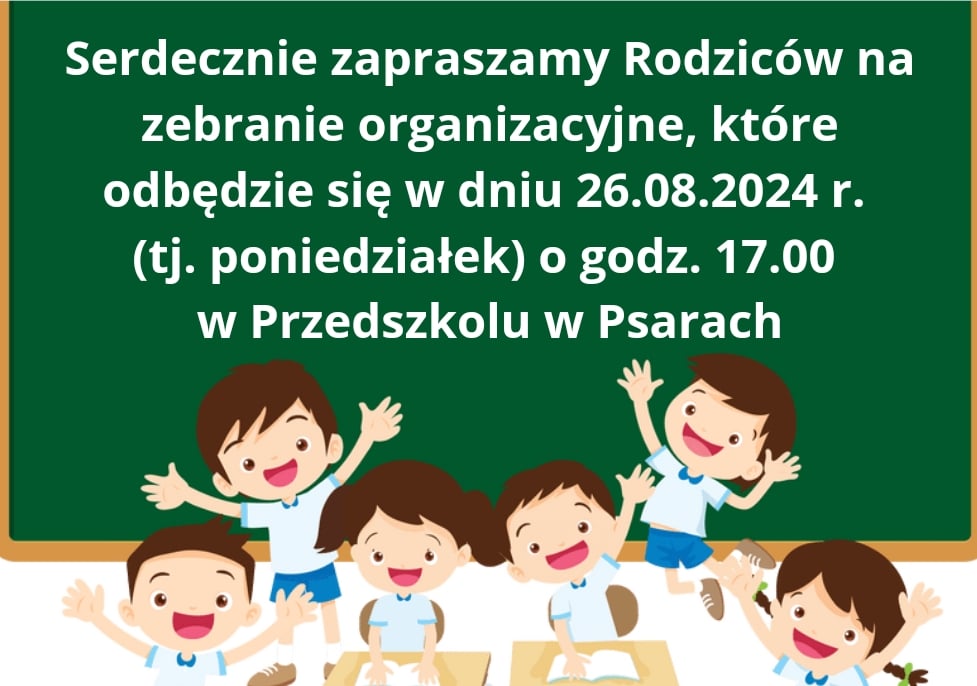 Serdecznie zapraszamy Rodziców na zebranie organizacyjne, które odbędzie się w dniu 26.08.2024 r. (tj. poniedziałek) o godz. 17.00 w Przedszkolu w Psarach.