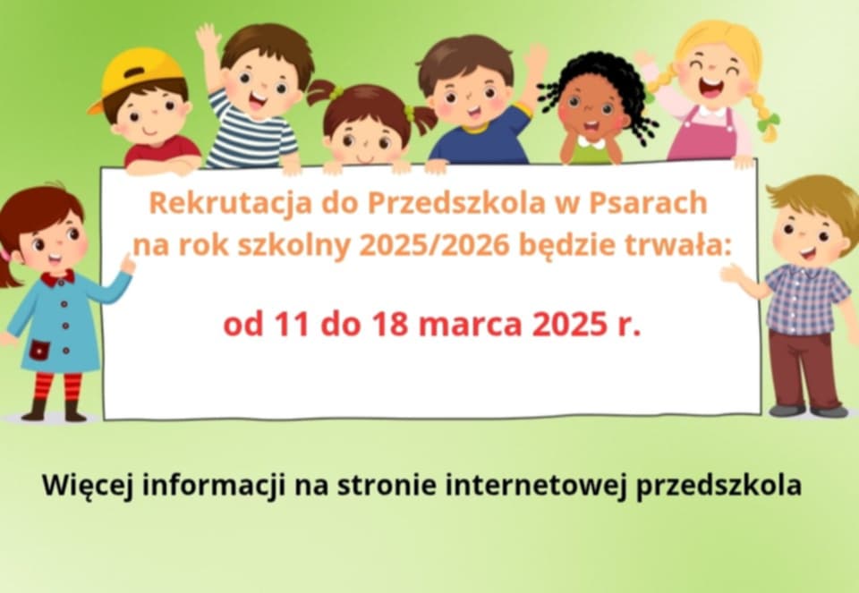 Zapisy dzieci do Przedszkola w Psarach na rok szkolny 2025/2026 będą odbywały się od 11 do 18 marca 2025 r.